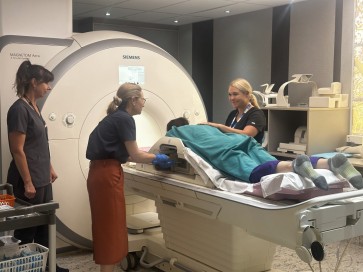 Pictured right: Dr Fiona Chambers (centre) performing the MRI-guided procedure. Supported by Sue Mayne, MRI Tech (left) and Charlotte Hawke, Clinical Tutor MRI Tech (right)..